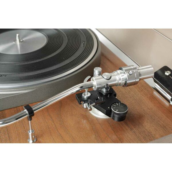 Ramię gramofonu zaprojektowano, aby dokładnie śledzić rowki płyty. Minimalizuje to zużycie płyt i igły. Dodatkowo, gramofon oferuje regulację nacisku igły, co pozwala na dopasowanie ustawień do rodzaju płyty. Użytkownik może dostosować ustawienia według własnych preferencji, co zapewnia pełną kontrolę nad brzmieniem.